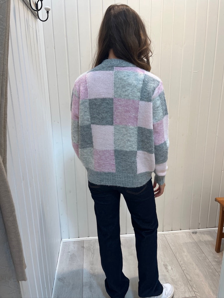 En lækker og hyggelig strik med store tern i grå, rosa og lyserød. Den har en rund hals, ribkant ved ærmer og bund, samt en let oversize pasform, der gør den både komfortabel og stilfuld.