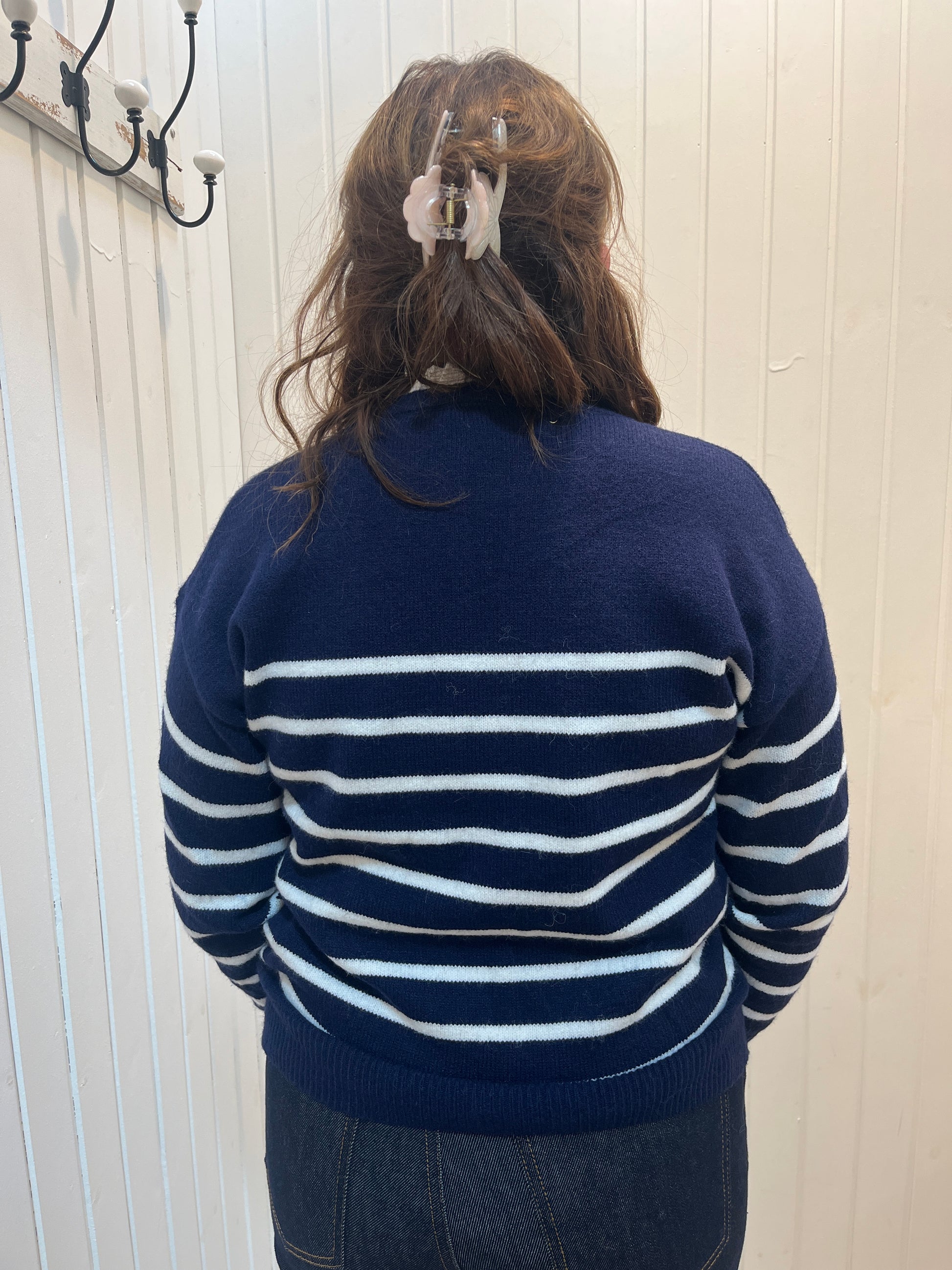 Meget sød blåstribet strik med flæse i kraven og på ærmerne med fine små sølv sløjfer som detaljer på ærmer.