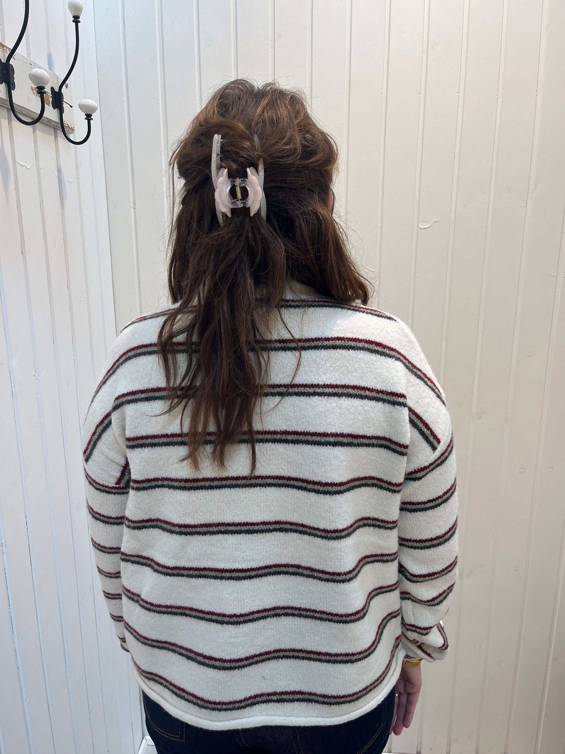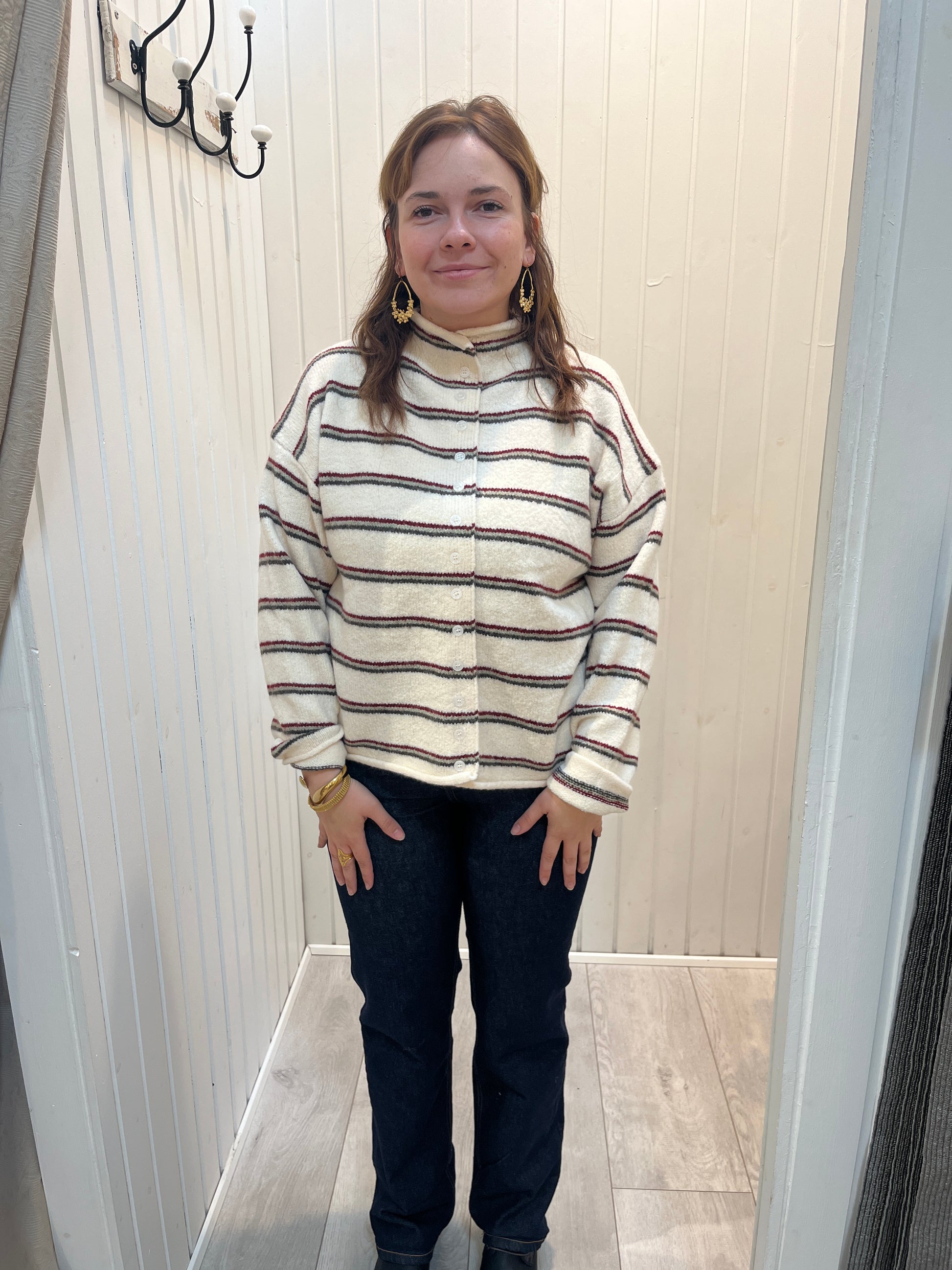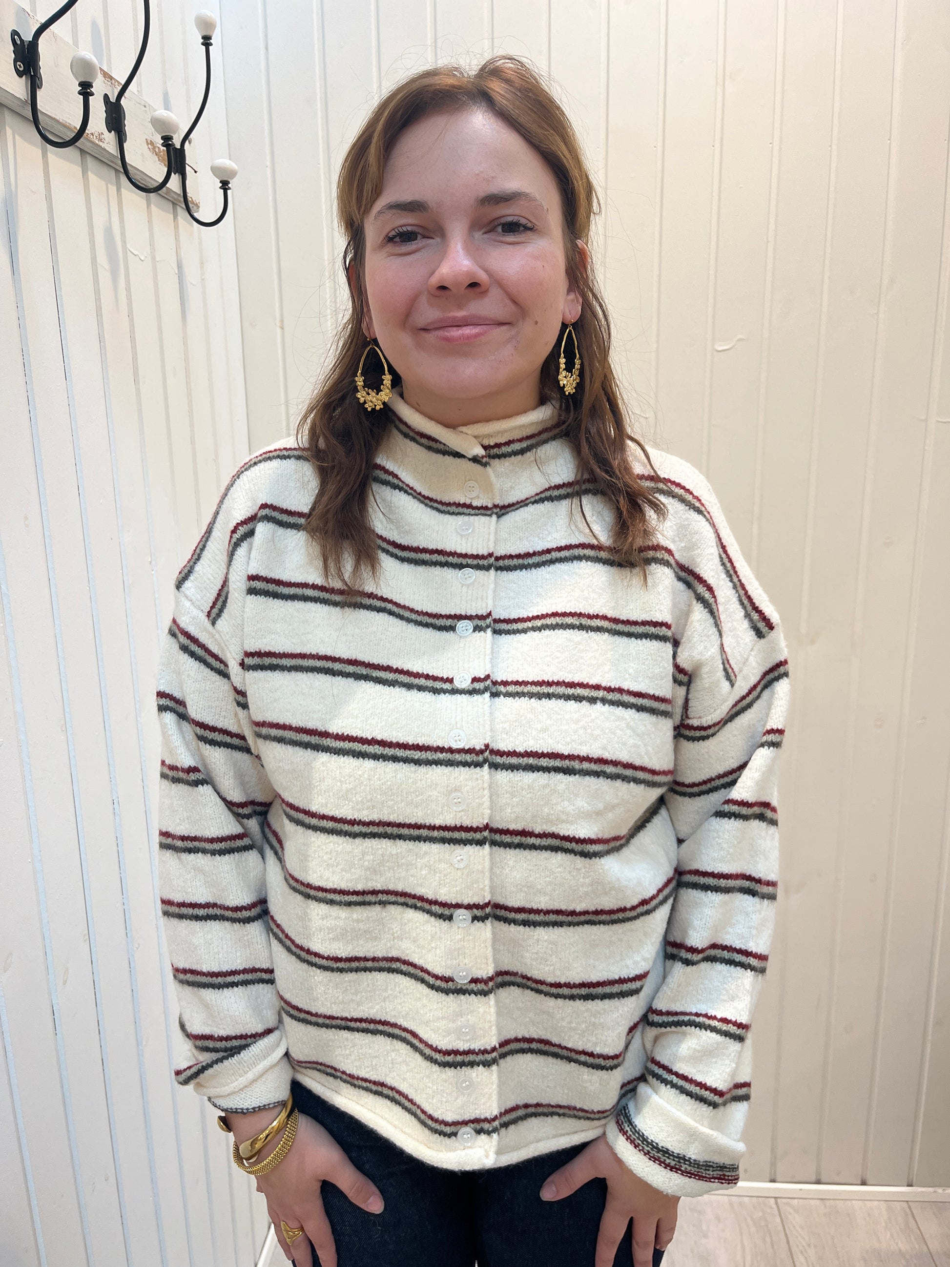 Sød strik med høj hals og striber. Pasformen er lige og behagelig og i one size.