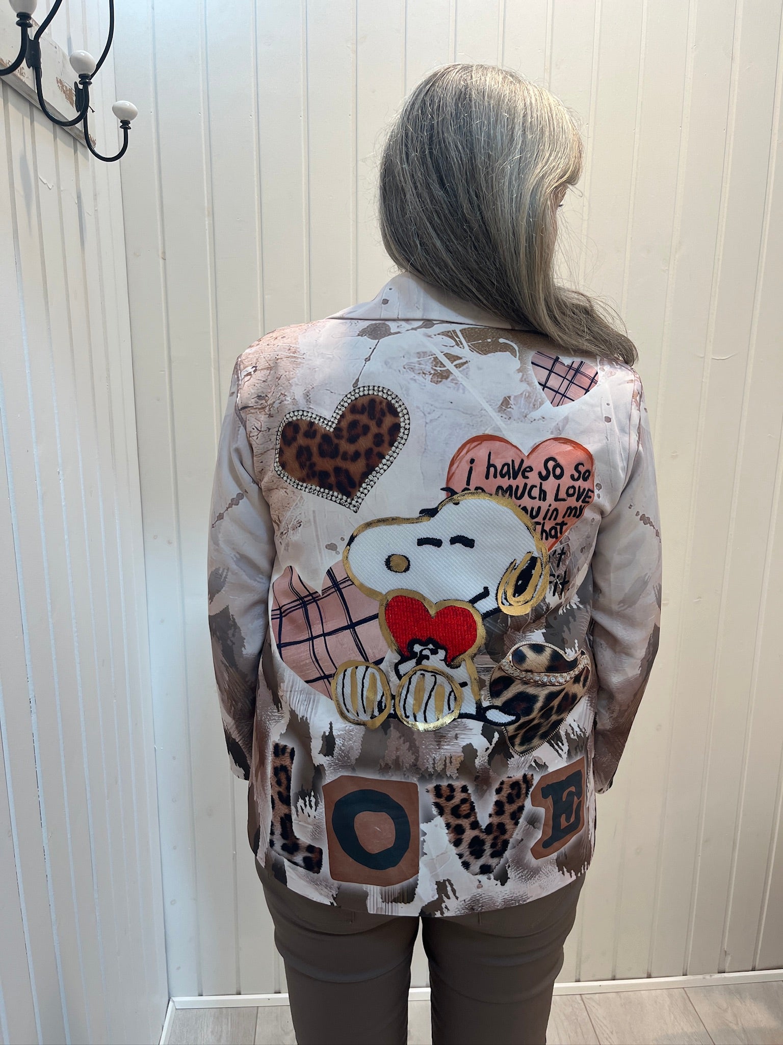 Unik Alcantara jakke med spændende farverigt mønster. Jakken har et flot motiv af nuser på ryggen. Jakken er one size og passer til størrelse 36-40.