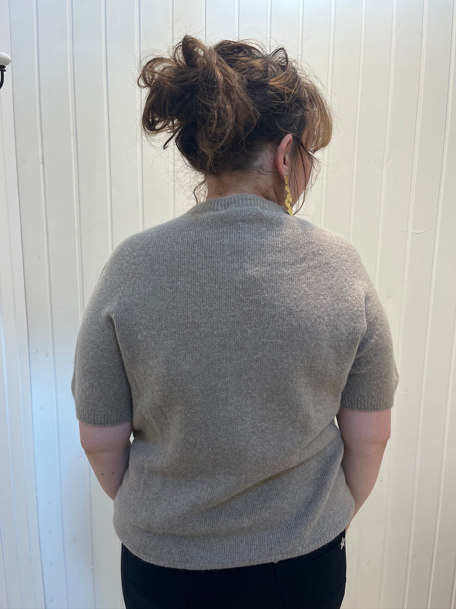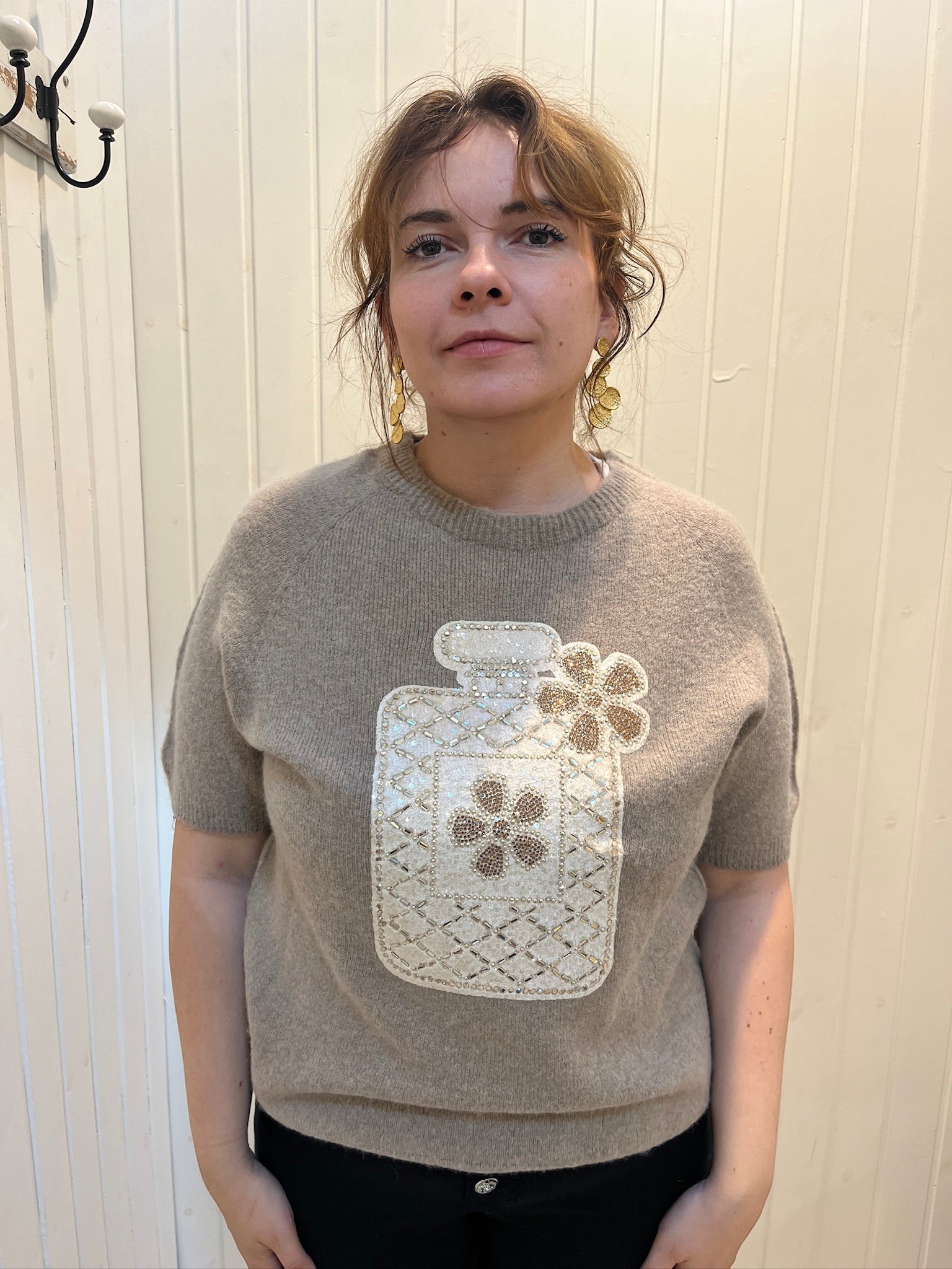 Blød strik med et flot motiv af en parfume foran med guld detaljer.
