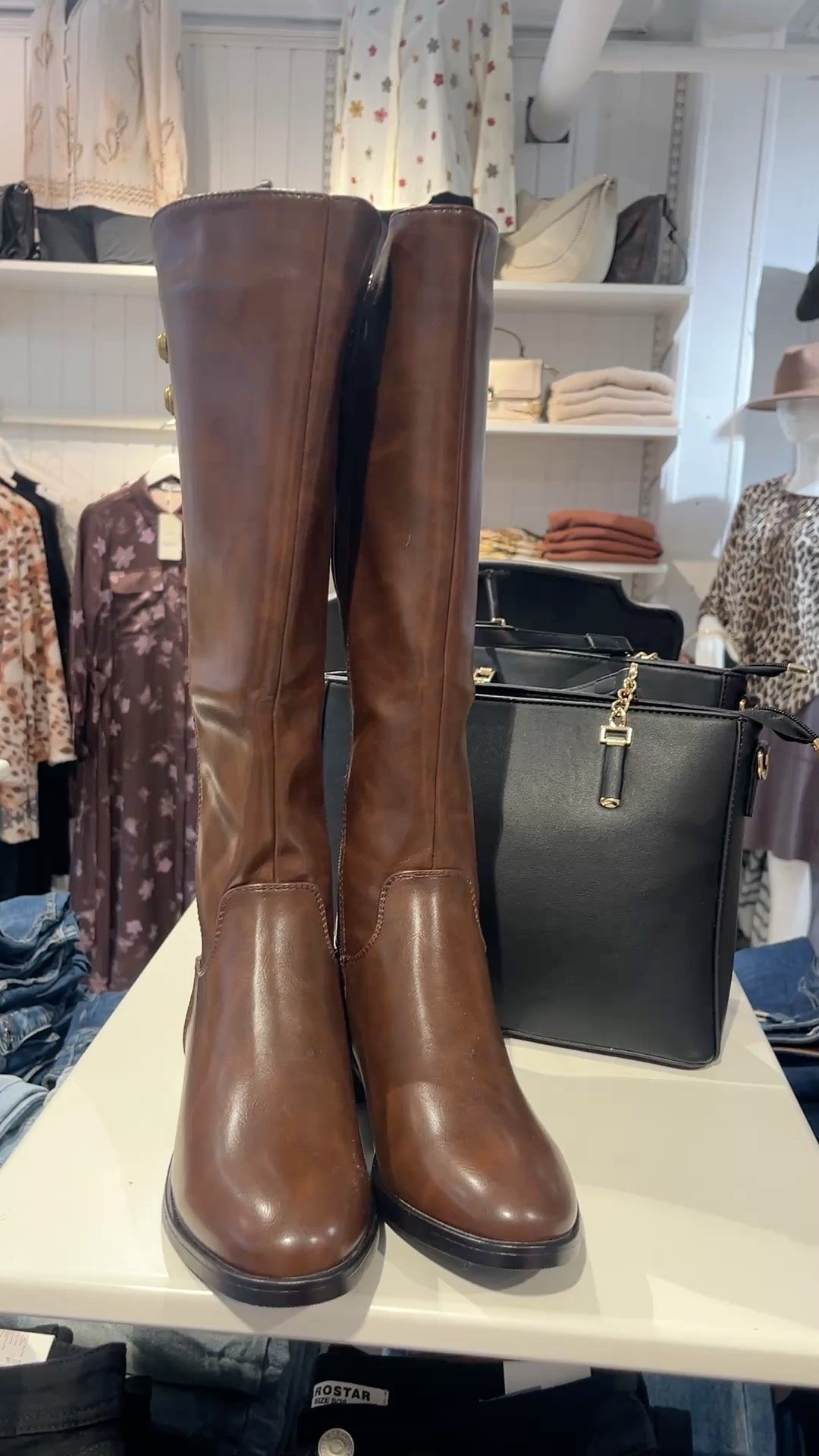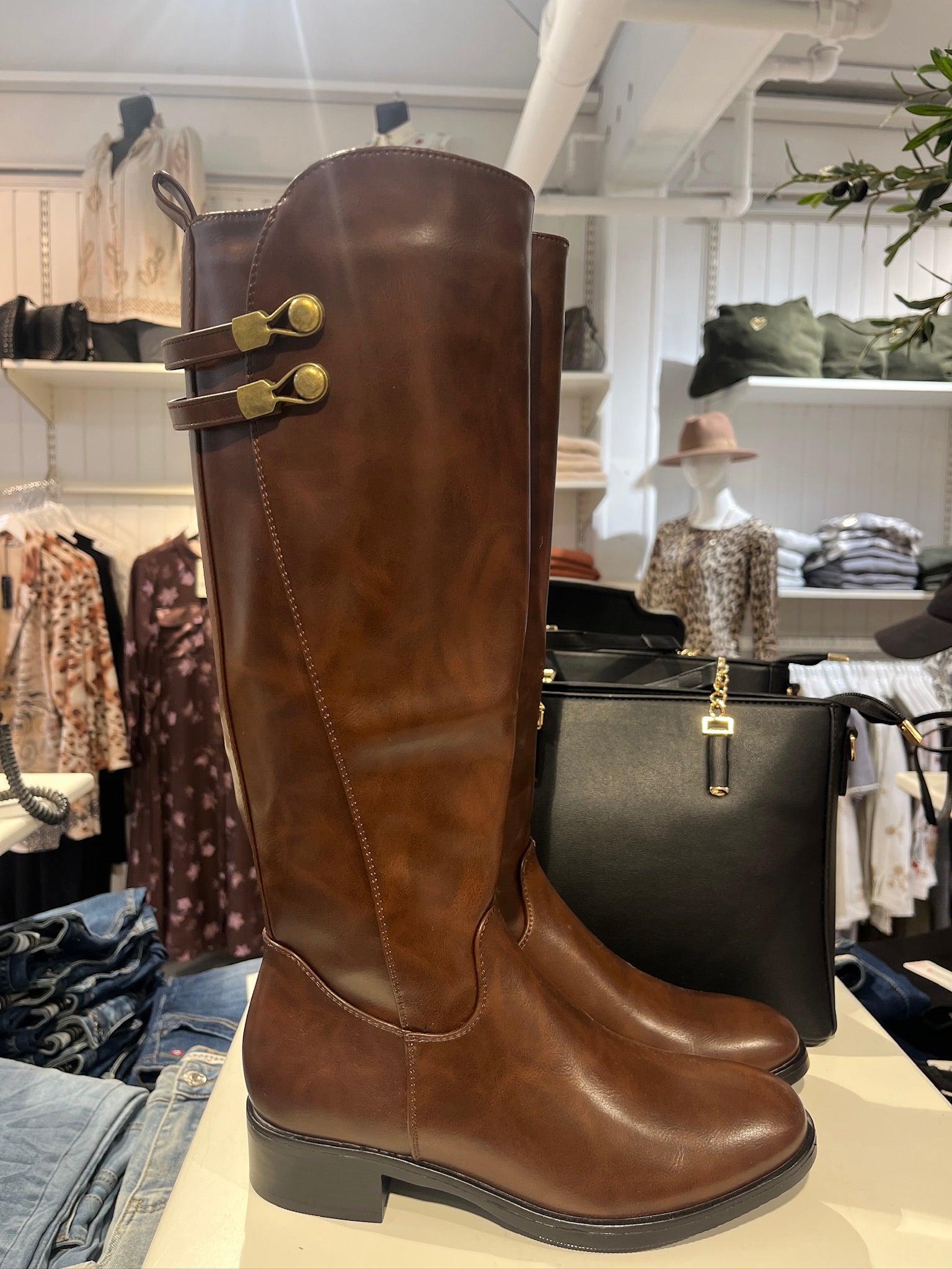 Elegante højt skaftede støvler med pynt på ydersiden og en smuk skinnende brun finish. Størrelsen er tilsvarende.