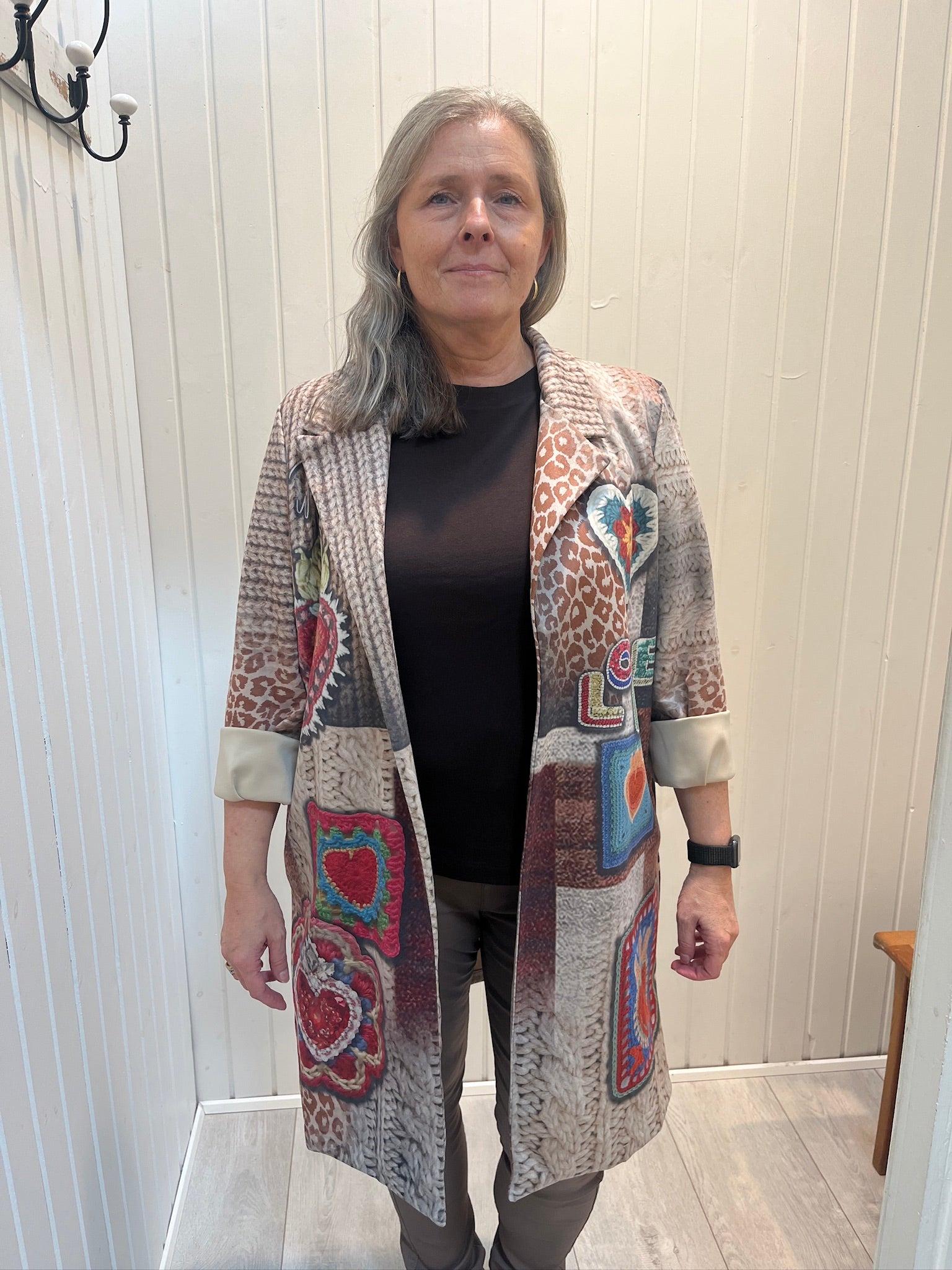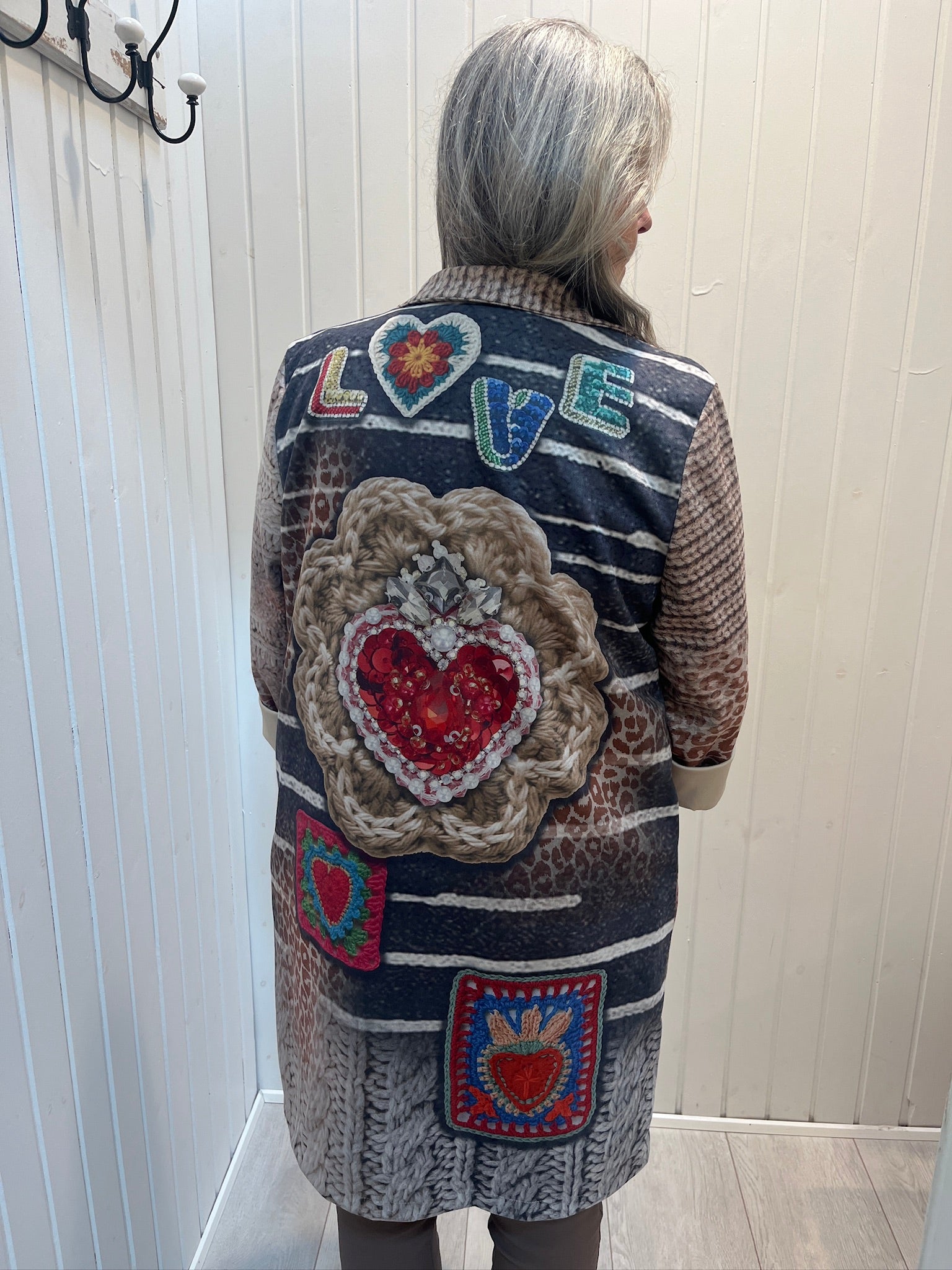 Unik Alcantara jakke med spændende farverigt mønster. Jakken har et flot “LOVE” motiv og dekorative hjerter på ryggen. Jakkene er one size og passer til størrelse 40-44.